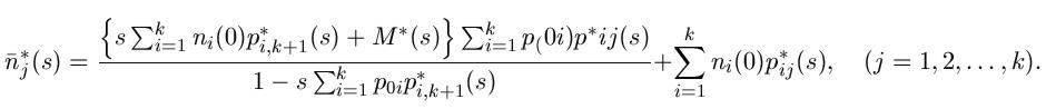 \[\bar n^*_j(s)=\frac{\left\{s\sum_{i=1}^k n_i(0)p^*{i,k+1}(s)+M^*(s)\right\}\sum_{i=1}^k p_{0i}p^*{ij}(s)}{1-s\sum_{i=1}^kp_{0i}p^*_{i, k+1}(s)}+\sum_{i=1}^kn_i(0)p^*_{ij}(s)[j= 1,2,\dots,k].\]