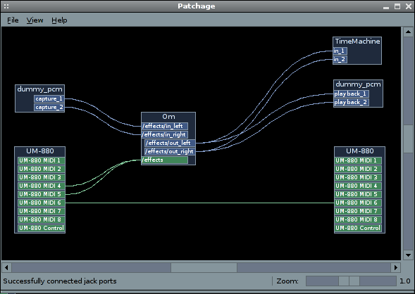 Om is a modular synthesizer (by Dave Robillard). It uses the same canvas as Patchage and thus looks very similar. Om can dynamically create and rename Jack ports on the fly, so it works well with Patchage as part of an audio system.