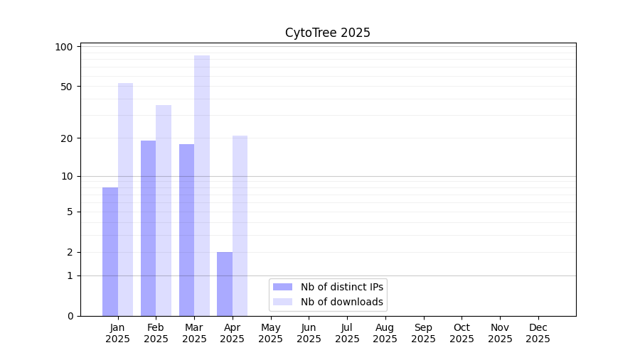 Number of downloads for software package CytoTree, year by year, from 2025 back to 2014 (years with no downloads are omitted):