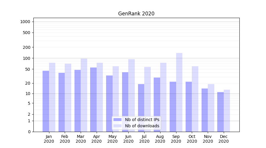 Number of downloads for software package GenRank, year by year, from 2025 back to 2014 (years with no downloads are omitted):