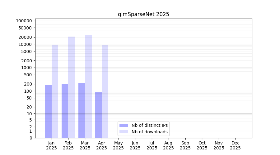 Number of downloads for software package glmSparseNet, year by year, from 2025 back to 2014 (years with no downloads are omitted):
