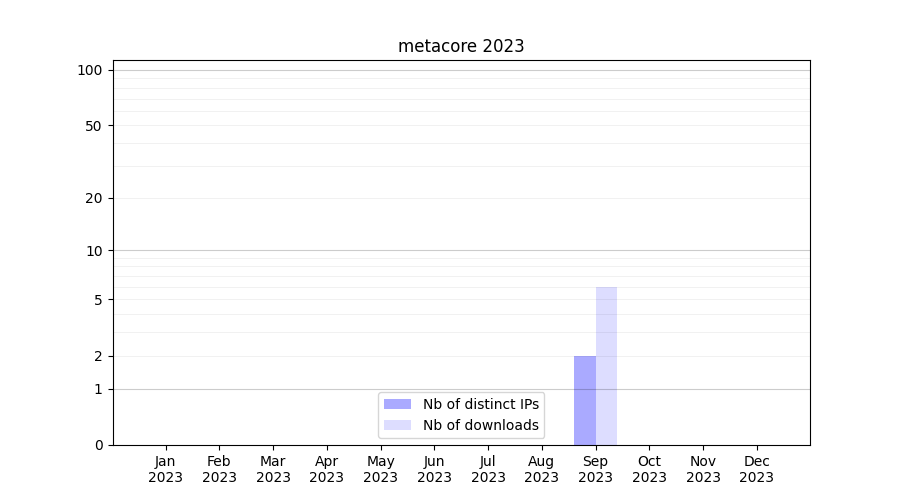 Number of downloads for software package metacore, year by year, from 2025 back to 2014 (years with no downloads are omitted):