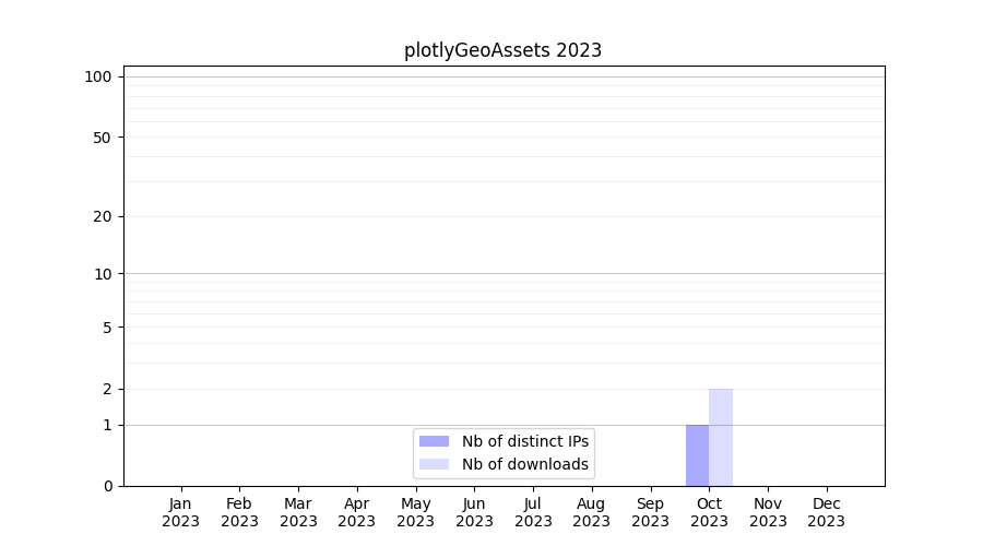 Number of downloads for software package plotlyGeoAssets, year by year, from 2025 back to 2014 (years with no downloads are omitted):