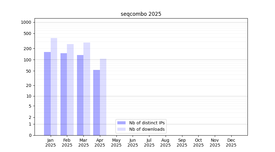 Number of downloads for software package seqcombo, year by year, from 2025 back to 2014 (years with no downloads are omitted):