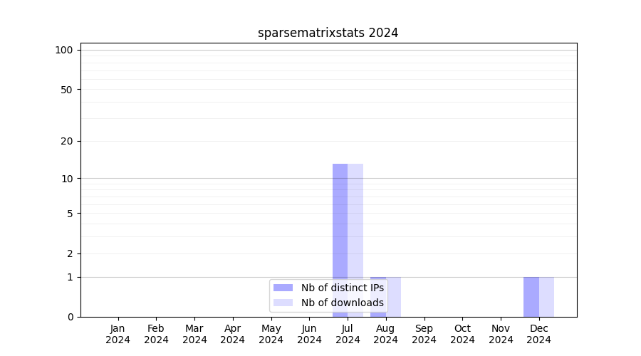 Number of downloads for software package sparsematrixstats, year by year, from 2025 back to 2014 (years with no downloads are omitted):
