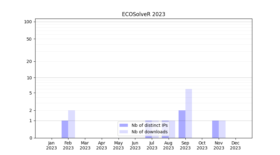 Number of downloads for annotation package ECOSolveR, year by year, from 2025 back to 2014 (years with no downloads are omitted):