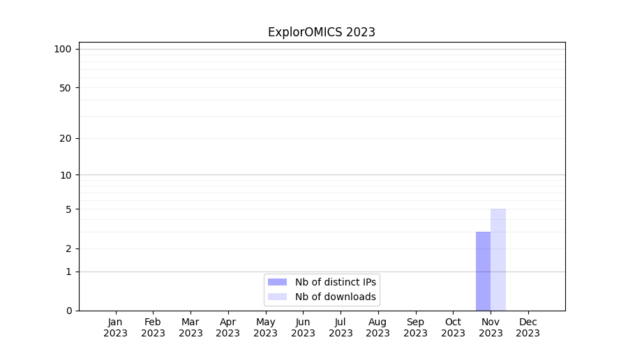 Number of downloads for annotation package ExplorOMICS, year by year, from 2025 back to 2014 (years with no downloads are omitted):