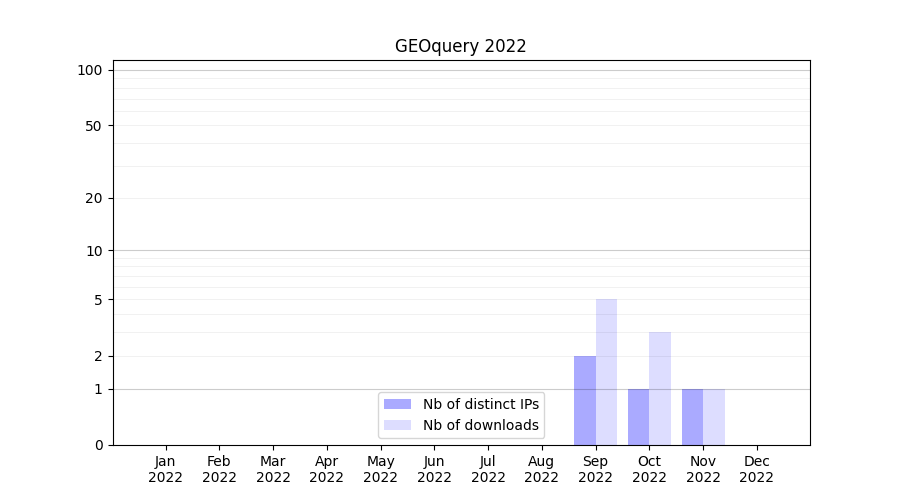 Number of downloads for annotation package GEOquery, year by year, from 2025 back to 2014 (years with no downloads are omitted):