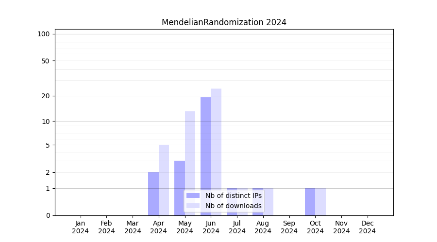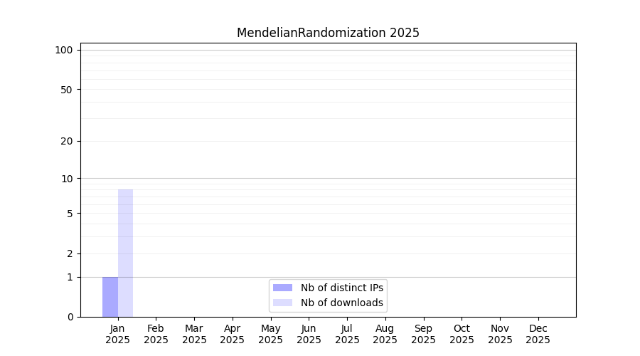 Number of downloads for annotation package MendelianRandomization, year by year, from 2025 back to 2014 (years with no downloads are omitted):