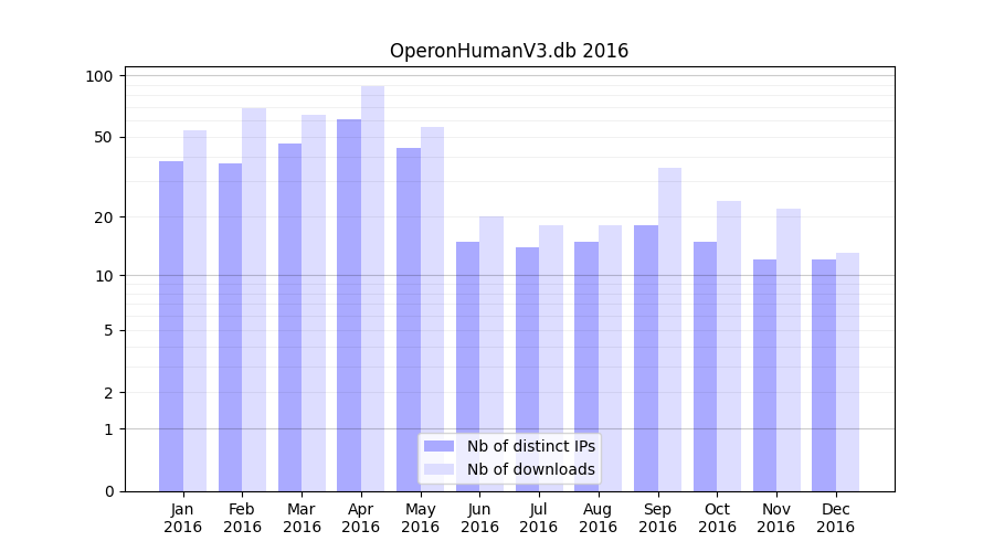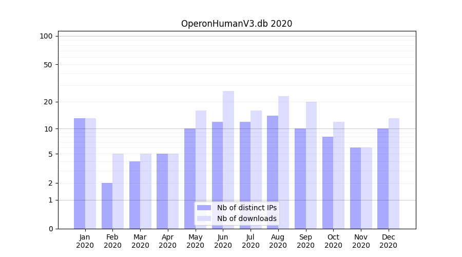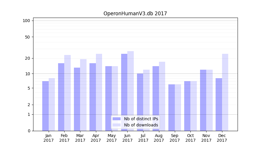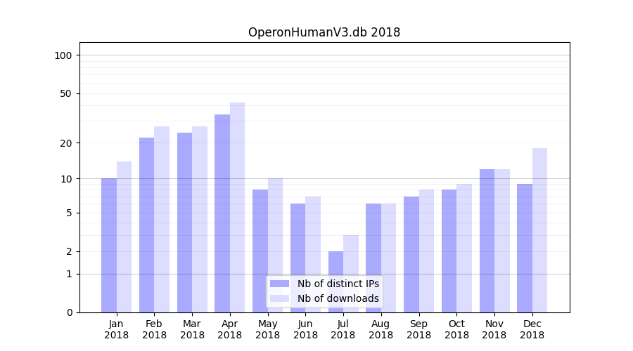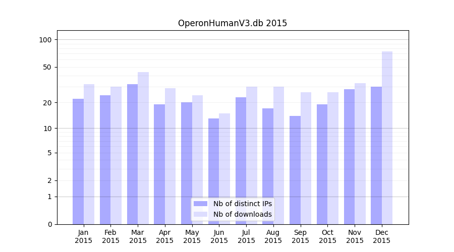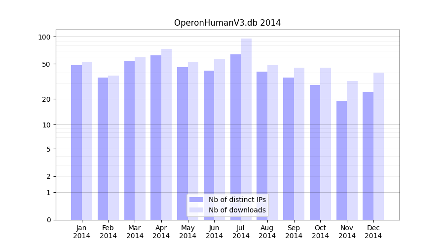 Number of downloads for annotation package OperonHumanV3.db, year by year, from 2025 back to 2014 (years with no downloads are omitted):
