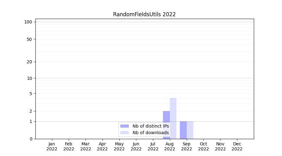 Number of downloads for annotation package RandomFieldsUtils, year by year, from 2025 back to 2014 (years with no downloads are omitted):