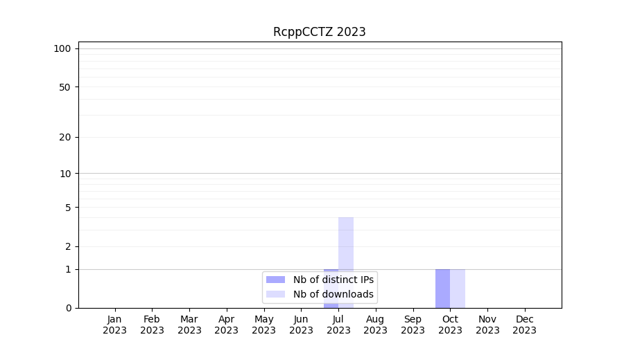 Number of downloads for annotation package RcppCCTZ, year by year, from 2025 back to 2014 (years with no downloads are omitted):