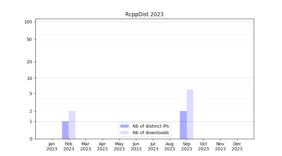 Number of downloads for annotation package RcppDist, year by year, from 2025 back to 2014 (years with no downloads are omitted):