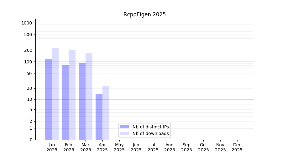 Number of downloads for annotation package RcppEigen, year by year, from 2025 back to 2014 (years with no downloads are omitted):