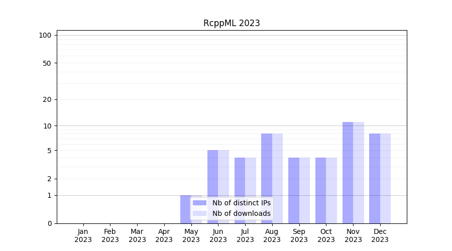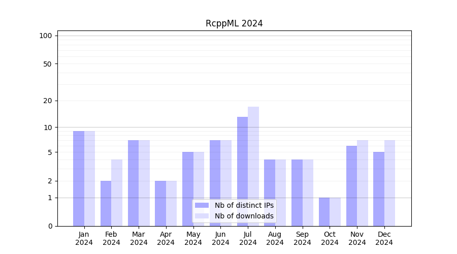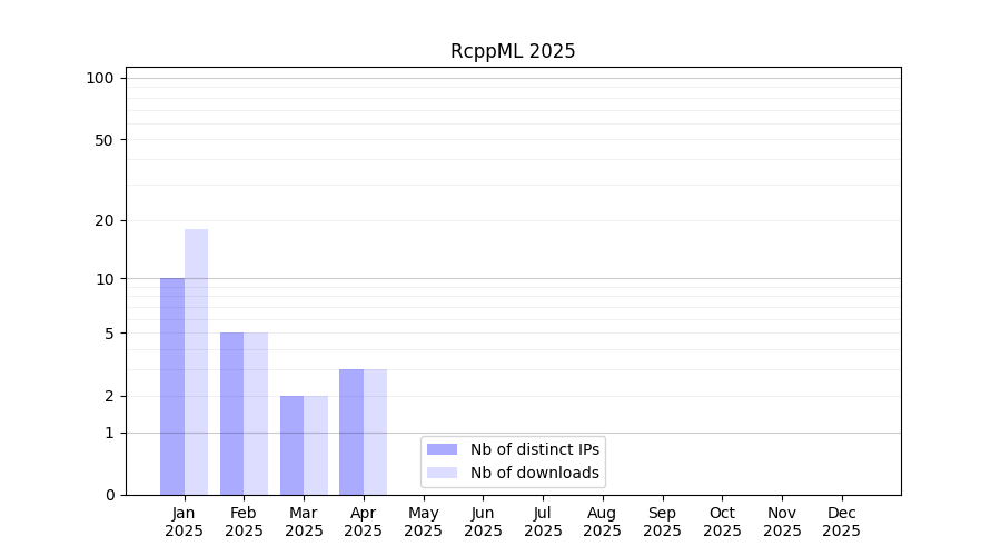 Number of downloads for annotation package RcppML, year by year, from 2025 back to 2014 (years with no downloads are omitted):