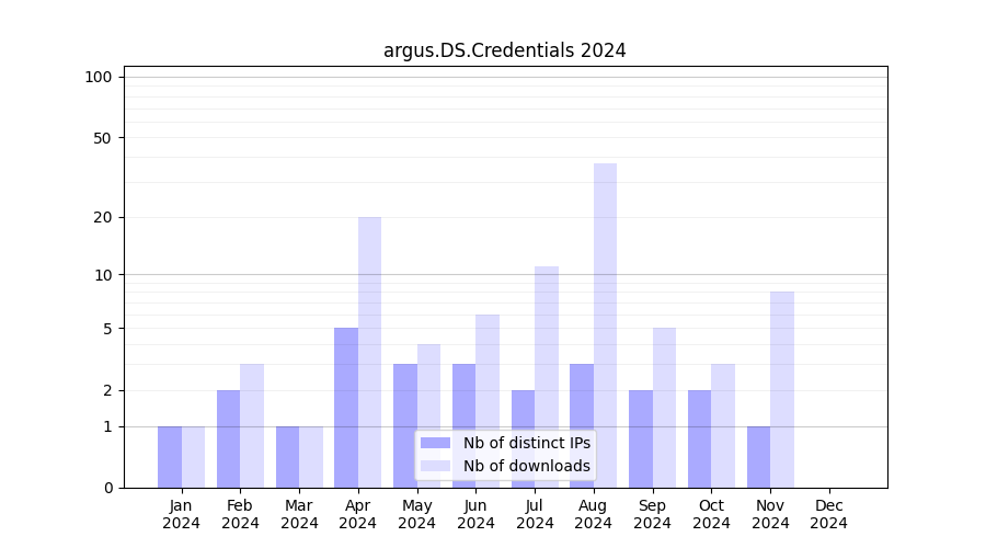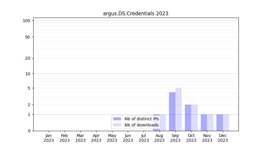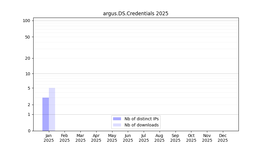 Number of downloads for annotation package argus.DS.Credentials, year by year, from 2025 back to 2014 (years with no downloads are omitted):