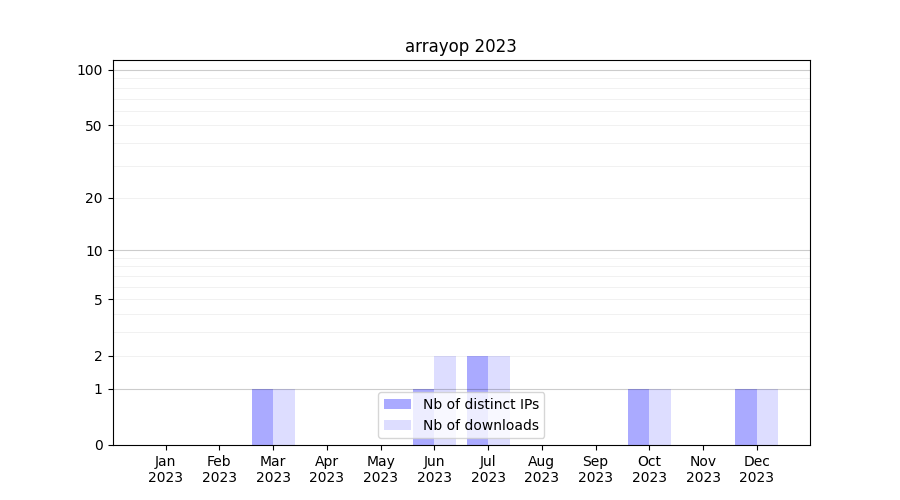 Number of downloads for annotation package arrayop, year by year, from 2025 back to 2014 (years with no downloads are omitted):