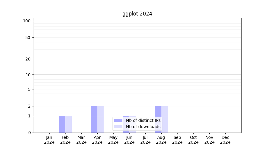 Number of downloads for annotation package ggplot, year by year, from 2025 back to 2014 (years with no downloads are omitted):
