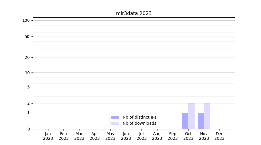 Number of downloads for annotation package mlr3data, year by year, from 2025 back to 2014 (years with no downloads are omitted):