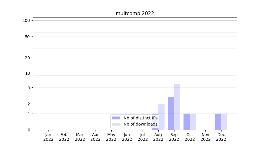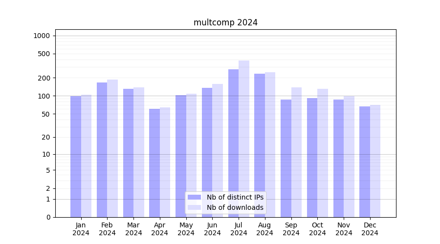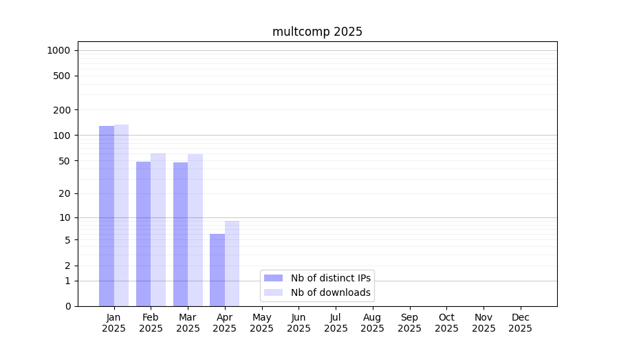 Number of downloads for annotation package multcomp, year by year, from 2025 back to 2014 (years with no downloads are omitted):