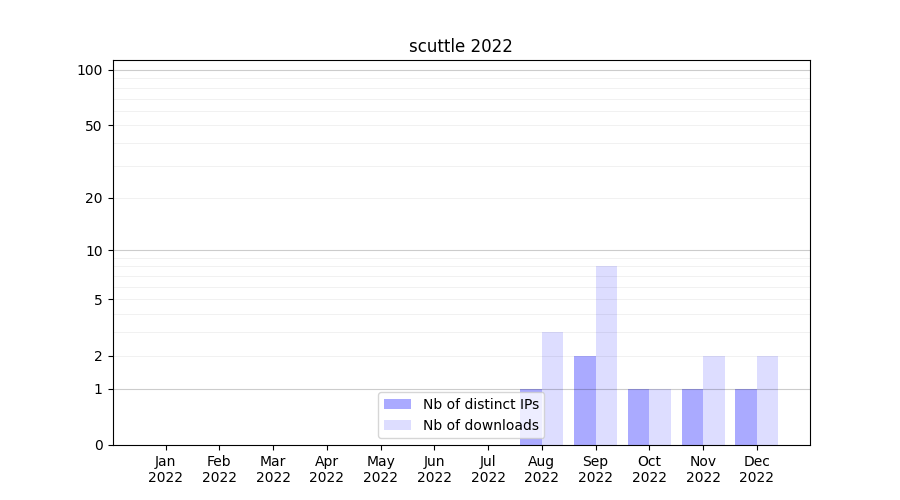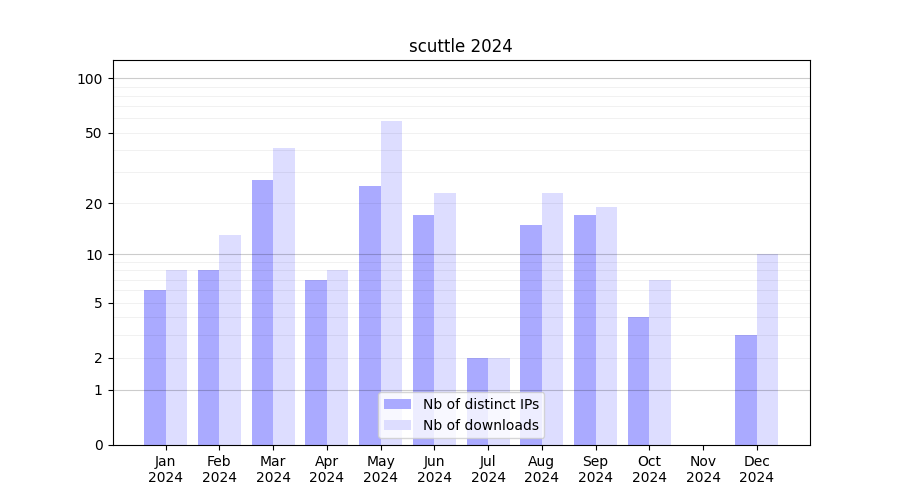 Number of downloads for annotation package scuttle, year by year, from 2025 back to 2014 (years with no downloads are omitted):