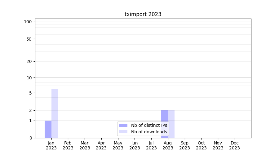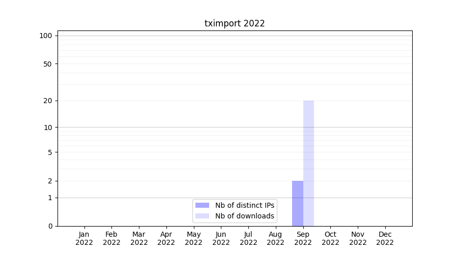 Number of downloads for annotation package tximport, year by year, from 2025 back to 2014 (years with no downloads are omitted):