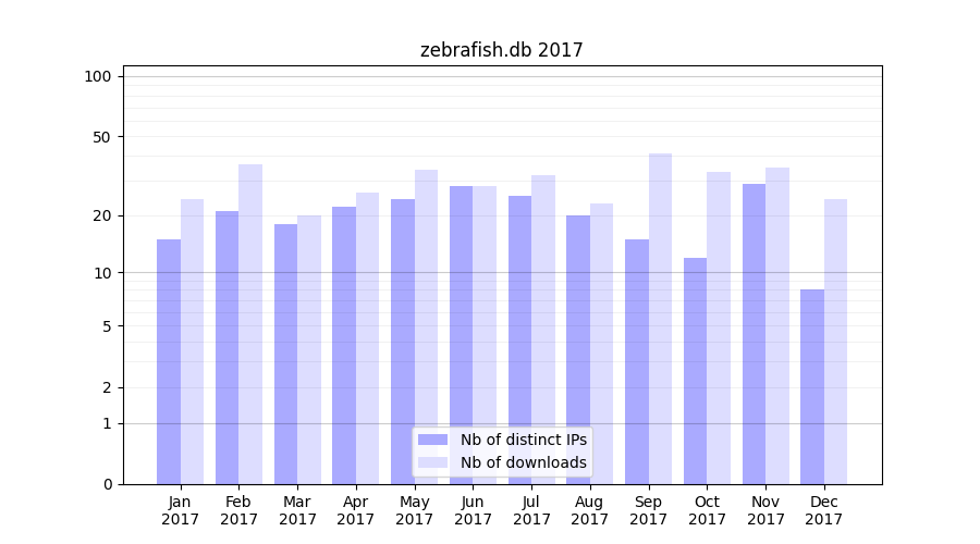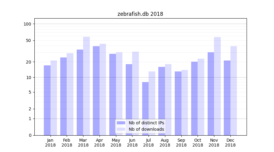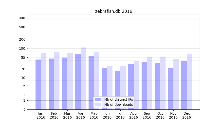 Number of downloads for annotation package zebrafish.db, year by year, from 2025 back to 2014 (years with no downloads are omitted):
