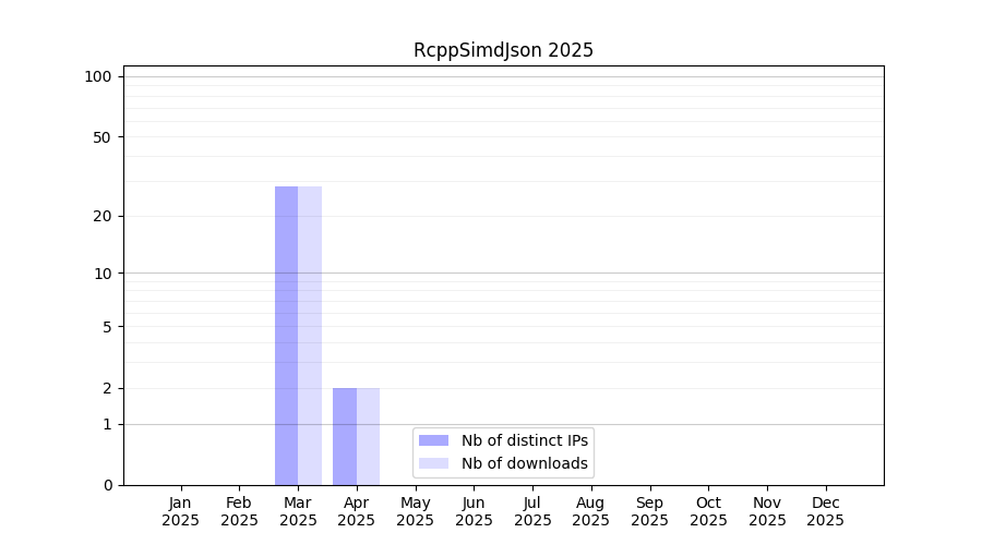 Number of downloads for experiment package RcppSimdJson, year by year, from 2025 back to 2014 (years with no downloads are omitted):