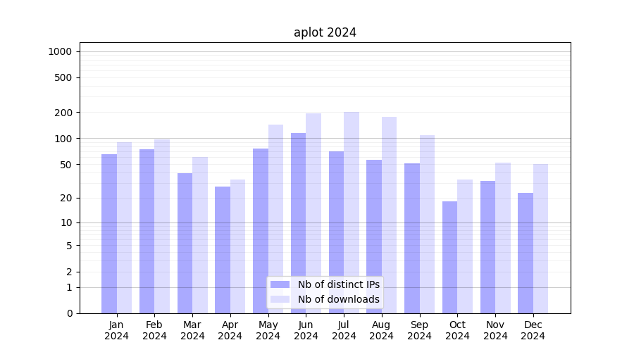 Number of downloads for experiment package aplot, year by year, from 2025 back to 2014 (years with no downloads are omitted):