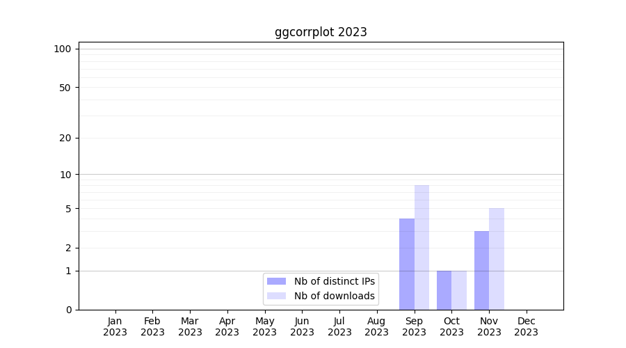 Number of downloads for experiment package ggcorrplot, year by year, from 2025 back to 2014 (years with no downloads are omitted):