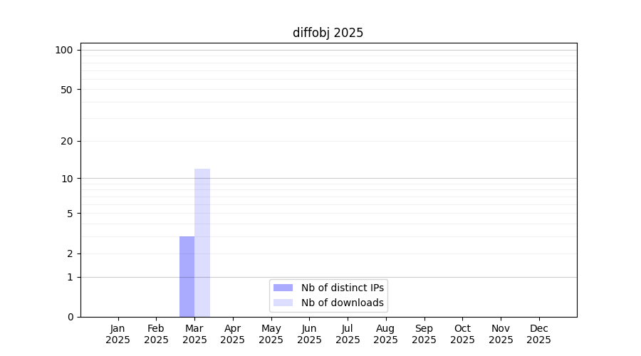 Number of downloads for workflow package diffobj, year by year, from 2025 back to 2015 (years with no downloads are omitted):