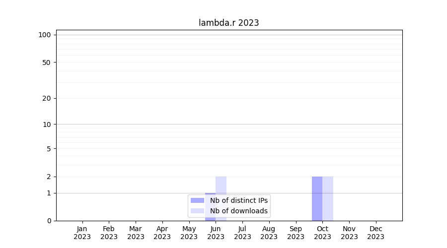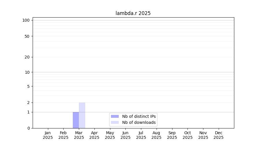 Number of downloads for workflow package lambda.r, year by year, from 2025 back to 2015 (years with no downloads are omitted):