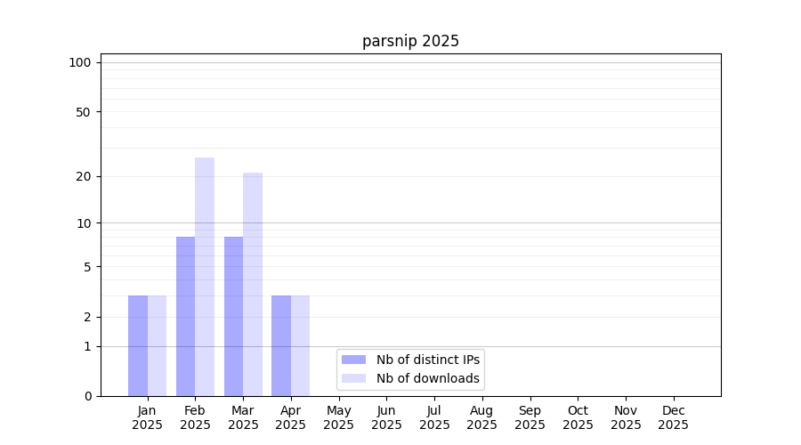 Number of downloads for workflow package parsnip, year by year, from 2025 back to 2015 (years with no downloads are omitted):
