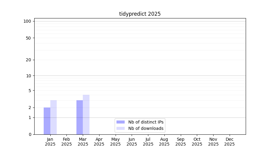 Number of downloads for workflow package tidypredict, year by year, from 2025 back to 2015 (years with no downloads are omitted):